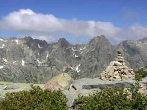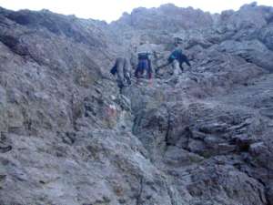 quatrième étape : Ascu-Stagnu --> Tighjettu. Départ 5 heures 30. cette étape est la technique. Le début de l'étape commence par la montée sous les anciennes pistes de ski. Puis l'on rejoint Bocca Tumasginesca (à 2183 mètres d'altitude). En compagnie de Thibaud, philippe et Jean-Marie nous nous sommes arrêtés au sommet pour manger un morceau de pain et de saucisson avant de descendre dans le cirque de la solitude. Un groupe d'Iltaliens très sympas nous a rejoint et a commencé à s'équiper en matériel d'escalade. A cet instant un immense doute nous a parcouru l'esprit car aucun d'entre nous n'avait prévu un tel matériel. finalement nous avons entamé la descente et il s'est avéré que le matériel d'escalade n'était pas nécessaire, car la descente est sécurisée par des chaines, ce qui est très apprécié étant donné notre équipement en chaussures de randonnée et avec un sac à dos assez volumineux. En bas du cirque de la solitude nous passons un névé avant de remonter la paroi sur l'autre versant pour passer le Bocca Minuta à 2218 mètres d'altitude. descente sur tighjettu ou nous arrivons à 13 heures 15. Le gite peut accueillir un trentaine de personnes. Un ravitaillement existe au gite. Douches chaudes.