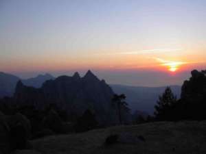 Treizième étape : Asinao --> Paliri. Départ à 5 heures 30. Au départ chemin en descente douce. A une intersection posibilité de continuer par le Gr20 ou de prendre la variante alpine qui monte vers les aiguilles de Bavella. J'ai pris la variante alpine. la montée s'effectue par un chemin raide. passer au col de Bavella 1218 mètres. Rejoindre Foce de Finosa 1218 mètres. Puis rejoindre le refuge de Paliri 1055 mètres d'altitude. Arrivée 12 heures 30. Le refuge ne comporte pas de ravitaillement, mais l'accueil y est exceptionnel. Le responsable du gite (un poête très sympa et très accueillant) a préparé une tisane avec des plantes des massifs (romarin, thym...). Le soir on peut profiter d'un point de vue magnifique au coucher du soleil. de plus le responsable du gite nous a fait observer des mouflons qui viennent paître près du gite. Une étape exceptionnelle.