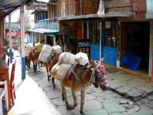 Notre circuit de tour des Anapurna commence le mercredi 28 mars par un transfert en van. Au départ 17 personnes étaient transportées et à l'arrivée nous avons fini à 20 personnes. L'intérieur étant complètement plein, les derniers occupants avaient pris place sur le toit avec les bagages (vive les transports en commun). Conduite très dangereuse sur routes étroites. Arrivée à Besi Sahar à 15 heures 30. Température 26°. J'ai relevé la position et l'altitude de chaque étape. Je vais noter quelques positions dans mon récit. Convoi de mulets à Ngadi
