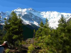 Lundi 02 avril. Température 12° à 7 heures. Départ à 7 heures 50. Arrêt à 11 heures 45 à Dhukure pour déjeuner. Traversé des couloirs d'avalanches. Arrivée à Pisang à 13 heures 25. Position N 28° 36,850' E 084° 08,876' altitude 3221 mètres. Vue sur les Anapurna