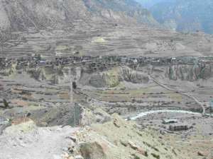 Mercredi 04 avril. température 6° à 7 heures dans chambre. Départ 8 heures. Arrêt au village de Braga, visite du monastère. Arrivée à Manang à 11 heures 15. altitude 3546 mètres. Mal dormi. Maux de Tête. Manang vu des hauteurs