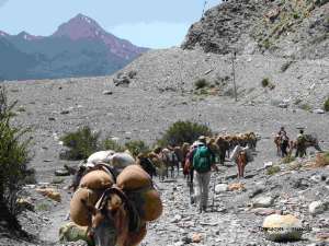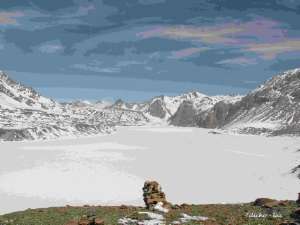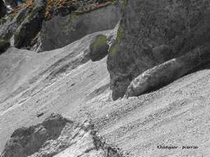 Samedi 07 avril. Départ 7 heures 30. Arrivée au lac Thilicho à 9 heures 45. Altitude 4998 mètres. Puis retour au camp de base du lac à 12 heures pour déjeuner. Départ à 13 heures 30. Arrivée à 15 heures 30 à Siri Karka. Position N 28° 40,820' E 083° 57,193' altitude 4086 mètres pression atmosphérique 654,5 mm. Etape périlleuse avec traversée de nombreux pierriers friables. Encore beaucoup de neige sur l'étape. A notre départ de Kathmandu cette étape n'était pas prévue car trop enneigée. Traversée de pierriers
