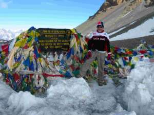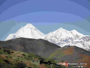 Lundi 09 avril. Départ à 3 heures 45 en direction du col Thorung La. L'ascencion commence par une paroi abrupte d'environ 600 mètres de dénivelé, puis se prolonge par une pente plus douce. C'est dans cette seconde partie que commence les difficultés dues au manque d'oxygène. Nausées et maux de tête. Arrivée au col à 7 heures 45. Altitude 5416 mètres. Pris quelques photos puis descente rapide pour atténuer les effets du mal de montagne. Arrêt à 10 heures 15 pour boire un thé à Chabarbu Mustang. Position N 28° 48,746 E 083° 53,607' altitude 4185 mètres. Arrivée à Muktinath à 11 heures 45. Position N 28° 48,932 E 083°51,840 altitude 3683 mètres. Le Dhaulagiri 8167 mètres