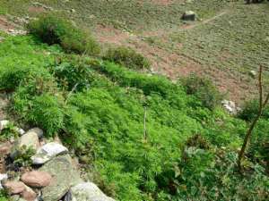 Jeudi 12 avril. Température 15° à 7 heures dans chambre. Départ 7 heures 45. Déjeuner à Kalopani à 10 heures 30. Arrivée à 15 heures 30 à Kopchepani. Altitude 1773 mètres. Le canabis pousse partout