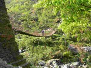 Vendredi 13 avril. Départ à 7 heures 45. Température 27° à 9 heures 30. Beau temps chaud. Arrivée à Tatopani à 11 heurs 15. Le village a des sources d'eau chaude. Franchissement d'un pont suspendu