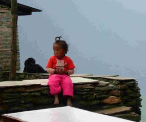 Vendredi 20 avril. Départ 7 heures 45. Arrivée à Chomroung à 11 heures 30. Pluie l'après midi. Enfant Népalalais à Chhomrong