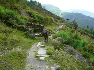 Samedi 21 avril. Départ 8 heures 10. Déjeuner à Komrong Danda à 11 heures 15. Départ 13 heures. Arrivée à 14 heures 15 à Ghandruk. altitude 2004 mètres. Buffle
