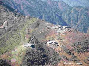 Lundi 16 avril. Temps doux. Il a plu légèrement la nuit avec orage. déjeuner à Ghursun à 10 heures 15. Départ à 11 heures 45. Nous avons pris la direction du sanctuaire des Anapurna. Arrivée à 13 heures 15 à Chomrong. Altitude 2180 mètres. Singes près du village de Bambou